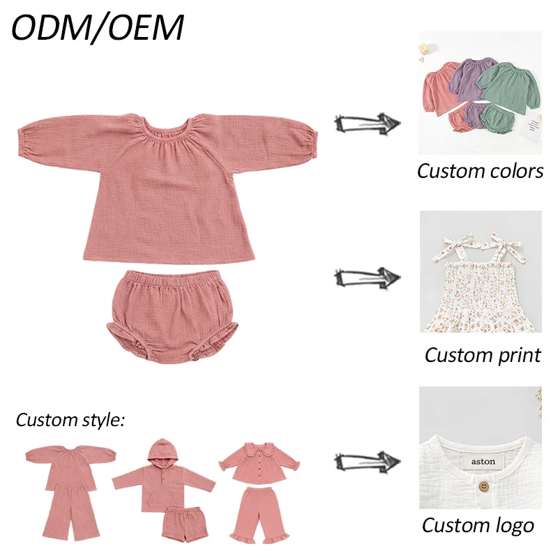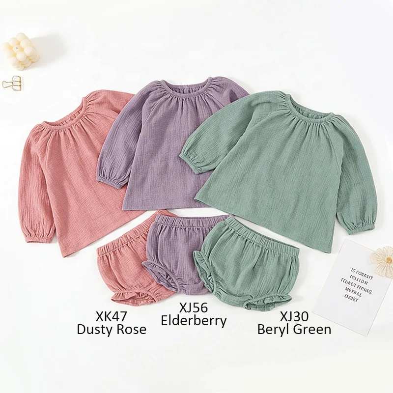 100% Organic Cotton Muslin Crepe Gauze Baby Clothes Oversize Long Sleeve Tee Shirt and Bloomer Shorts Set