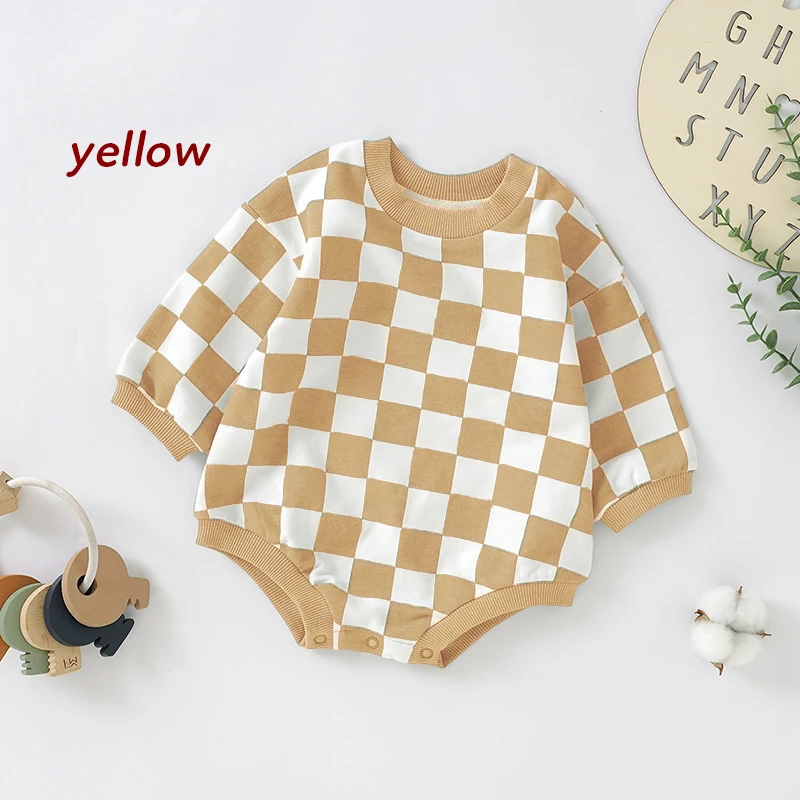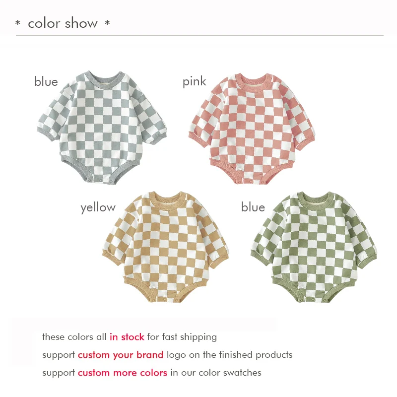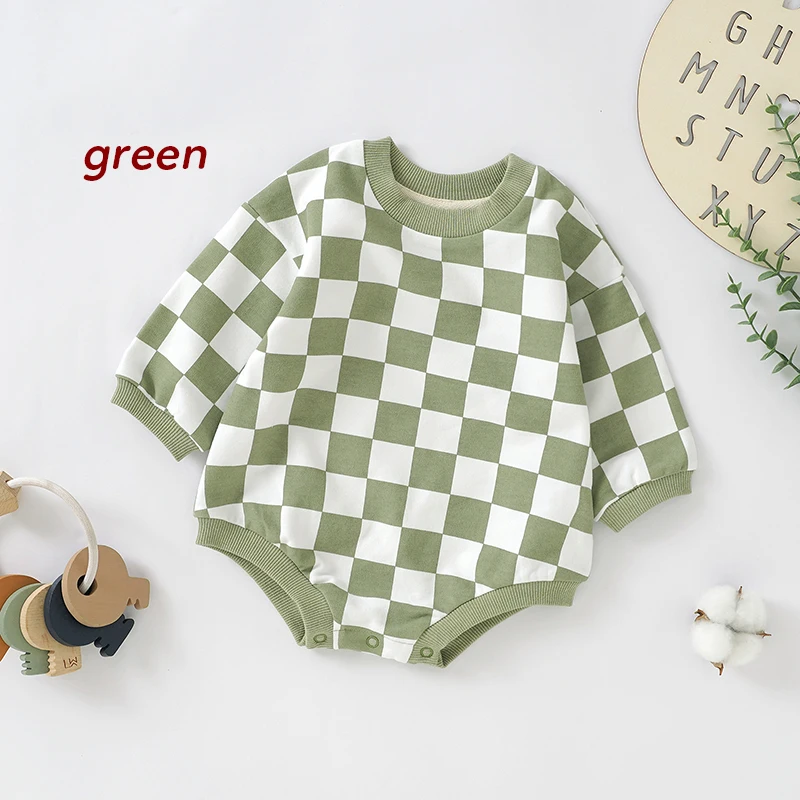 2023 French Terry Fashion Print Checkered Grid Cute Autumn Winter Oversized Baby Bubble Rompers Clothing