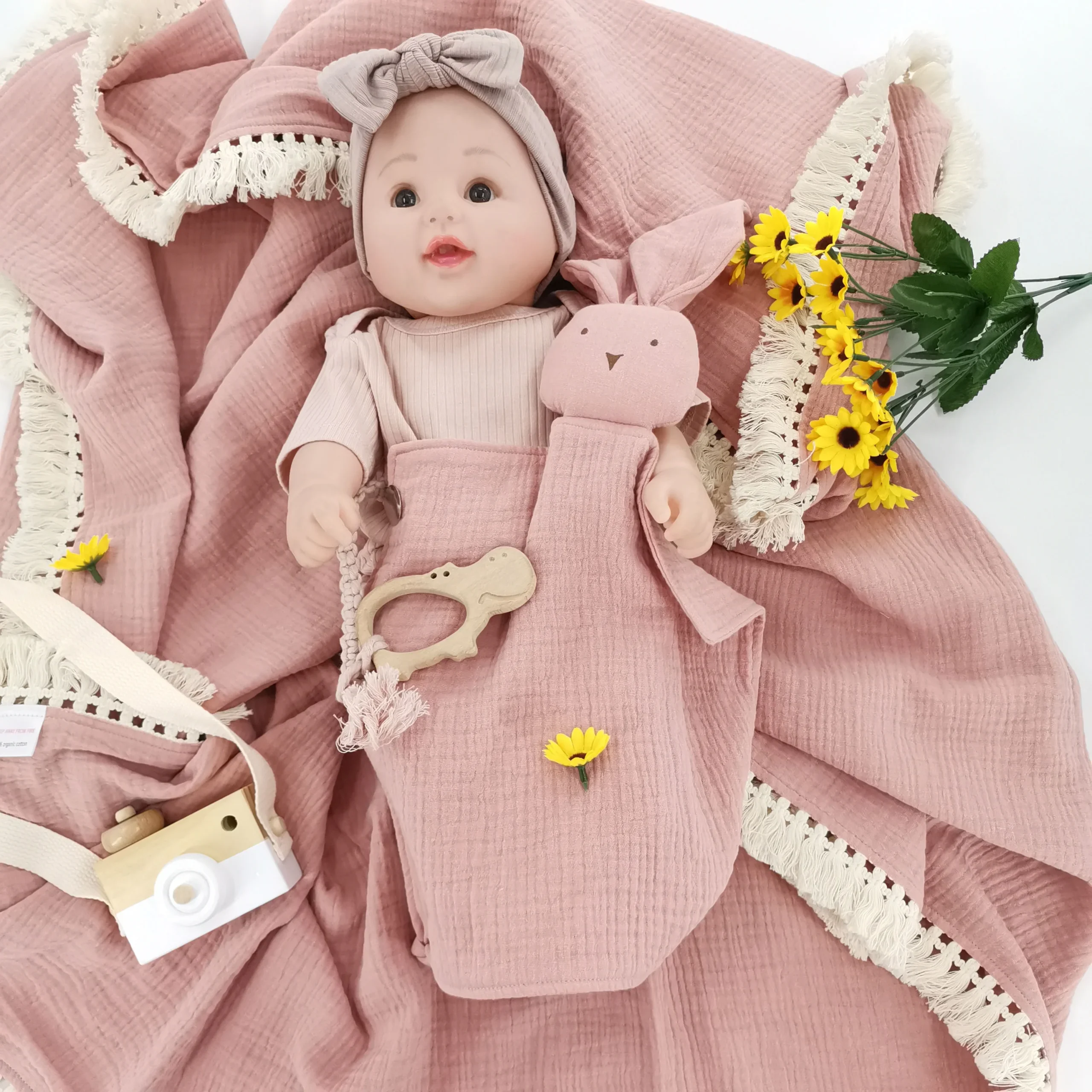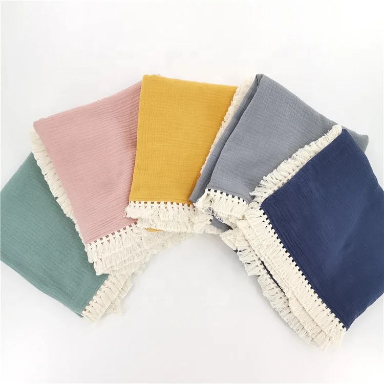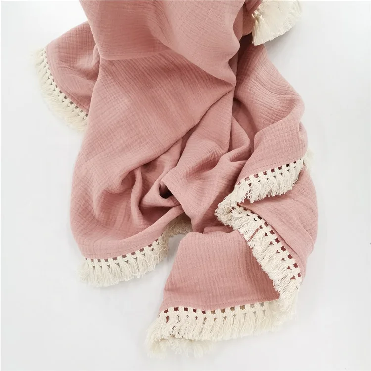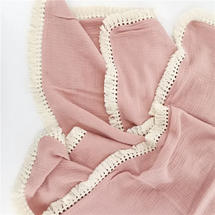 Double Layers Baby Tassel Trim Organic Muslin Swaddle Baby Blanket