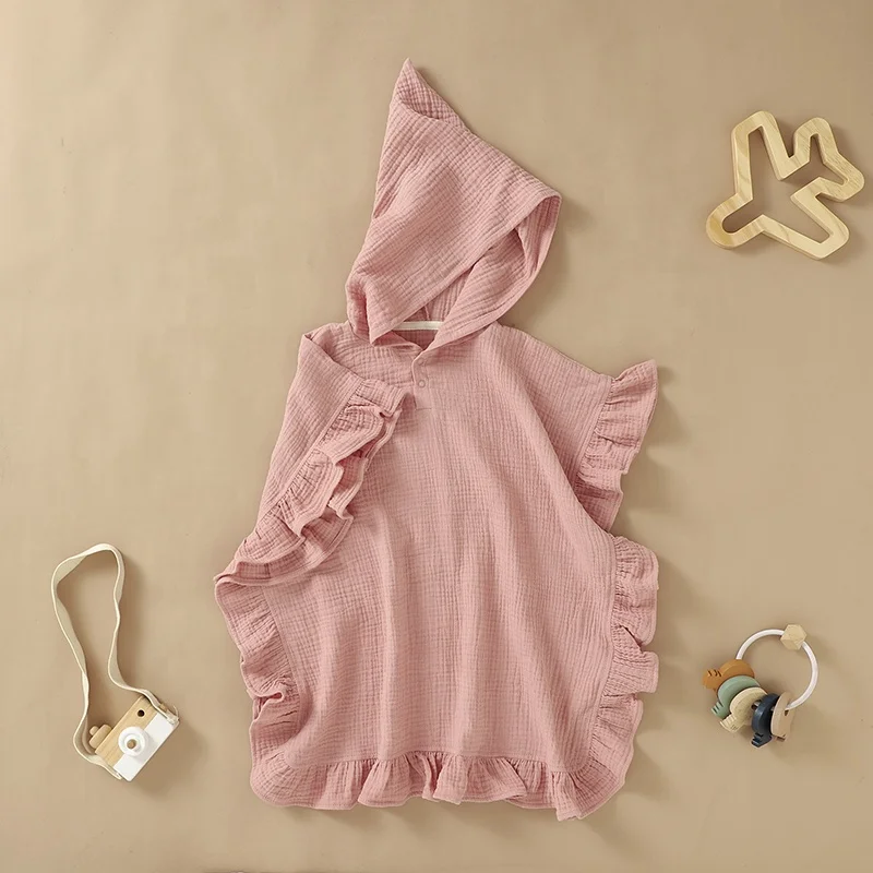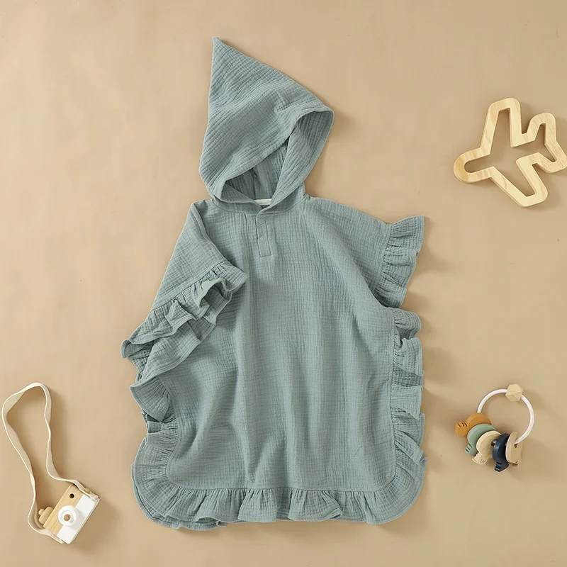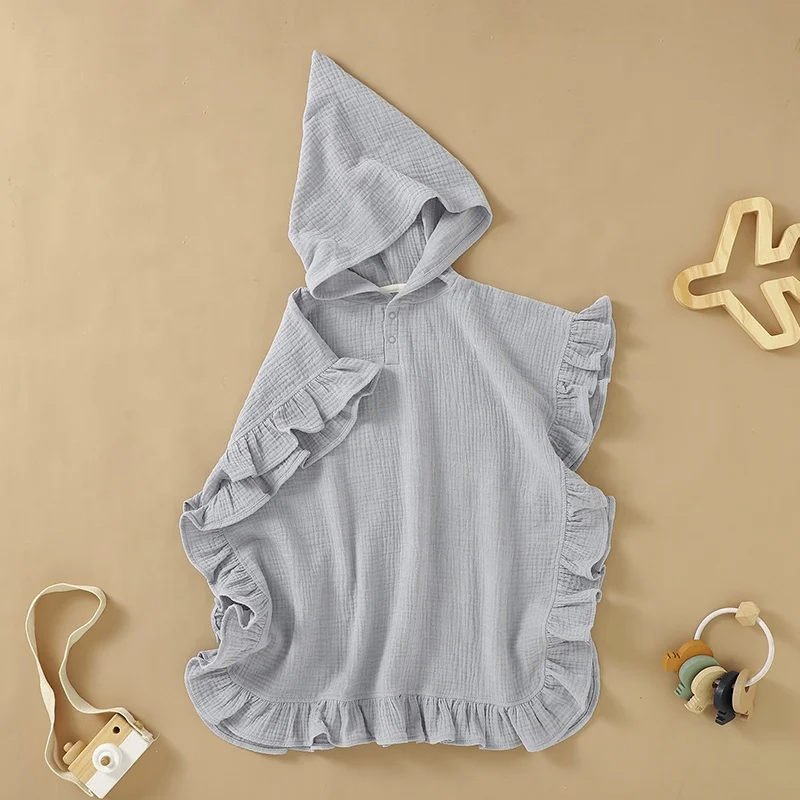 Wholesale Frill Hem Organic Cotton Muslin Hooded Baby Bath Robe, Baby Bath Robe